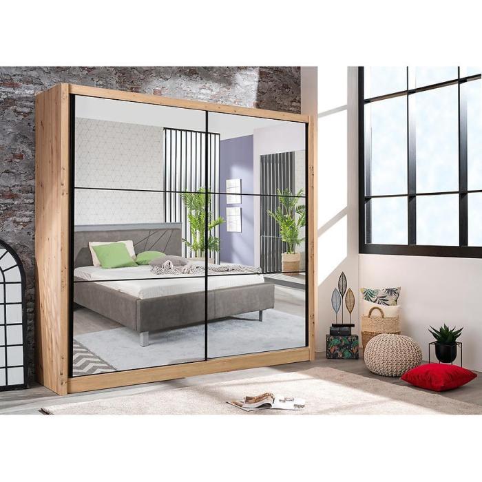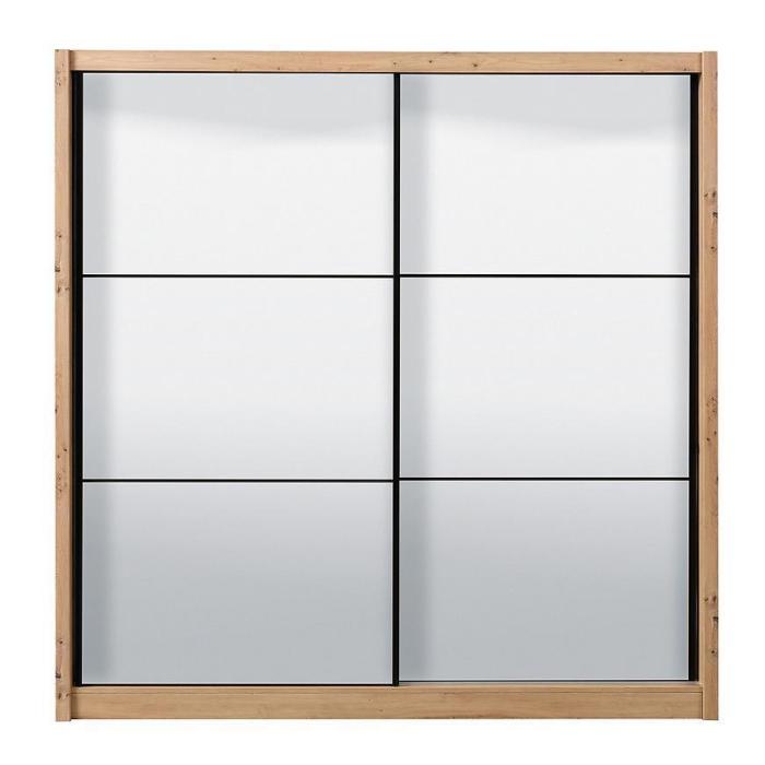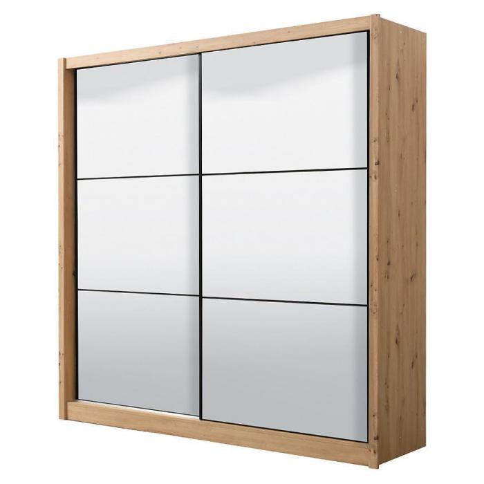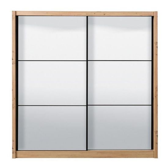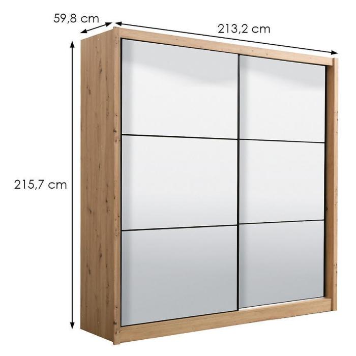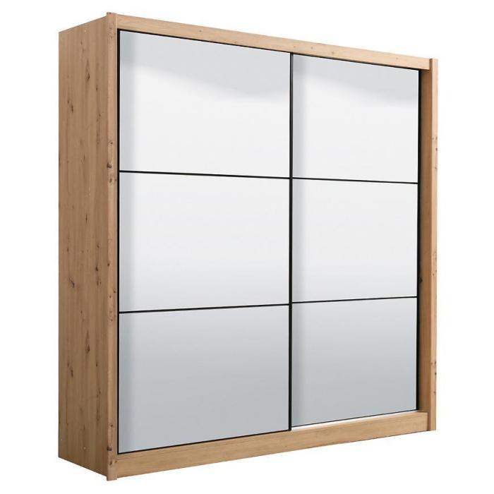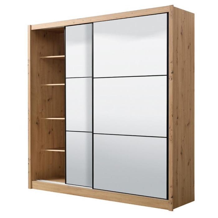 Szafa przesuwna Navara to propozycja do pokoju dziennego, ale znajdzie swoje miejsce również w innym pomieszczeniu, jak na przykład - przedpokój czy garderobie. Materiał wykonania to płyta wiórowa laminowana. Szafa posiada półki oraz drążek na ubrania. Mebel posiada lustro, które sprawi, że pomieszczenie stanie się optycznie większe. Nowoczesny styl mebli wpadnie do gustu każdemu, kto poszukuje eleganckiego, klasycznego, a zarazem nowoczesnego umeblowania. Idealnie wpasuje się w większość aranżacji. Przeznaczona do samodzielnego montażu.
