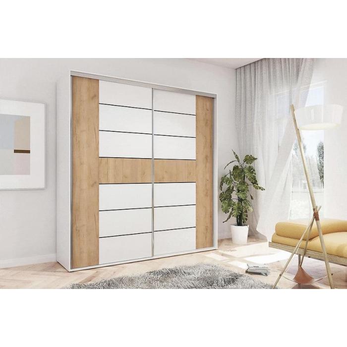 Szafa w kolorze biały/craft złoty z kolekcji Nela to doskonała propozycja do pokoju dziennego, ale znajdzie swoje miejsce również w innym pomieszczeniu, jak na przykład - przedpokój czy garderobie, sypialni. Materiał wykonania to płyta laminowana. W środku szafa posiada półki oraz drążek na ubrania. Wygląd szafy sprawi, że wpasuje się w większość aranżacji. Szafa będzie świetnym miejscem do wieszania ubrań, na buty lub inne domowe tekstylia. Pojemna szafa to praktyczny i solidny mebel, który cechuje się ciekawym designem i połączeniem kolorów. Idealnie wpasuje się w większość aranżacji. Szafa przeznaczona do samodzielnego montażu.