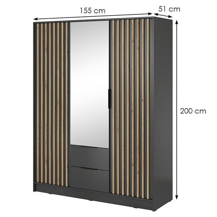 Szafa uchylna w kolorze grafit/dąb artisan to propozycja do pokoju dziennego, ale znajdzie swoje miejsce również w innym pomieszczeniu, jak na przykład - przedpokój czy garderobie. Materiał wykonania to płyta laminowana. Szafa posiada półki oraz drążek na ubrania. Mebel posiada lustro, które sprawi, że pomieszczenie stanie się optycznie większe. Nowoczesny styl mebli wpadnie do gustu każdemu, kto poszukuje eleganckiego, klasycznego, a zarazem nowoczesnego umeblowania. Idealnie wpasuje się w większość aranżacji. Przeznaczona do samodzielnego montażu. Mebel do samodzielnego montażu.