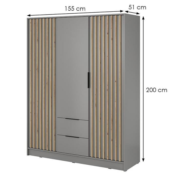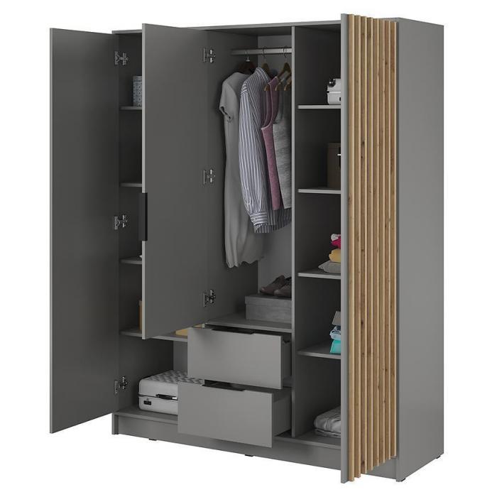 Szafa uchylna w kolorze szary/dąb artisan to propozycja do pokoju dziennego, ale znajdzie swoje miejsce również w innym pomieszczeniu, jak na przykład - przedpokój czy garderobie. Materiał wykonania to płyta laminowana. Szafa posiada półki oraz drążek na ubrania. Nowoczesny styl mebli wpadnie do gustu każdemu, kto poszukuje eleganckiego, klasycznego, a zarazem nowoczesnego umeblowania. Idealnie wpasuje się w większość aranżacji. Przeznaczona do samodzielnego montażu. Mebel do samodzielnego montażu.