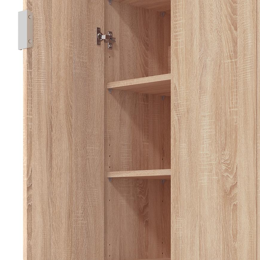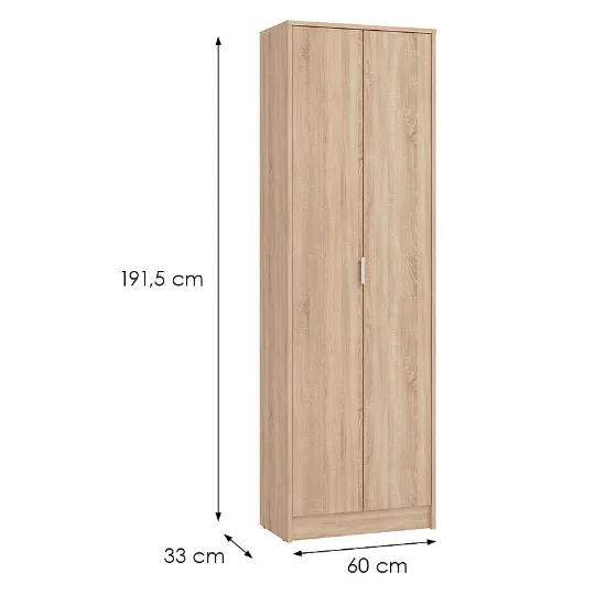 Dzięki dwudrzwiowej konstrukcji szafa oferuje przestronną przestrzeń do przechowywania odzieży i innych akcesoriów. Wykonana z płyty wiórowej laminowanej o grubości 18 mm, zapewnia trwałość i odporność na codzienne użytkowanie. Jej matowe wykończenie frontów oraz korpusu dodaje elegancji i nowoczesności.