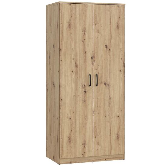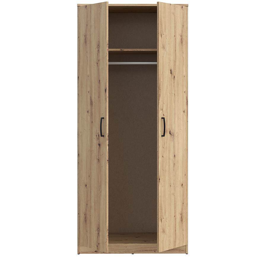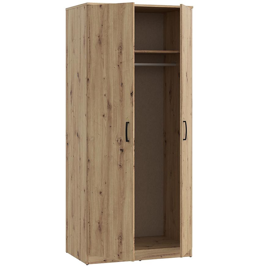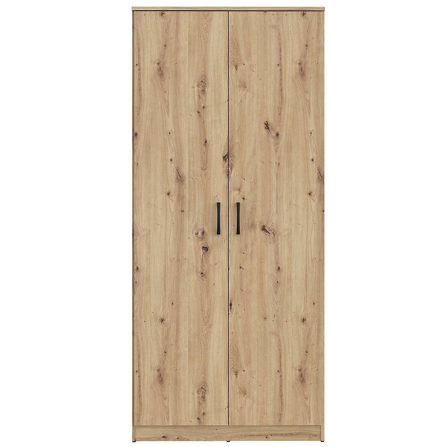 Klasyczna bryła szafy sprawia, że pasuje do wielu różnych aranżacji wnętrz. Jej jasne drewnodpodobne wybarwienie w odcieniu dąb artisan, nadaje jej elegancji i ciepła. Zarówno fronty, jak i korpus wykonane są z płyty wiórowej laminowanej, co gwarantuje trwałość i solidność. Matowe wykończenie podkreśla styl szafy i jej estetykę, ale jest także praktyczne podczas codziennego użytkowania.