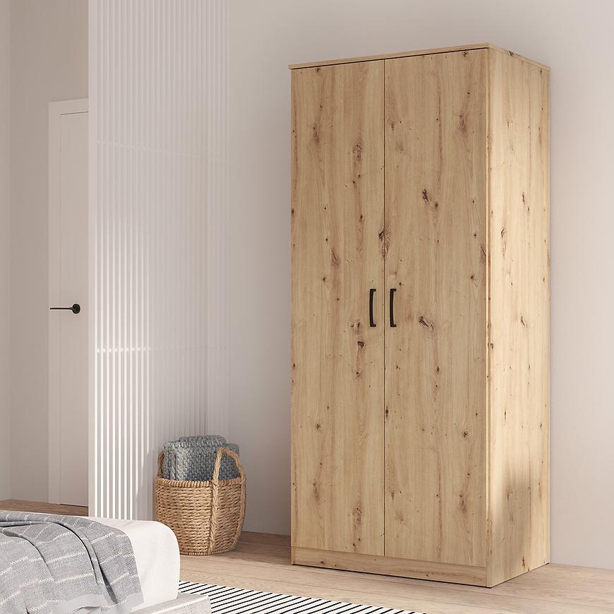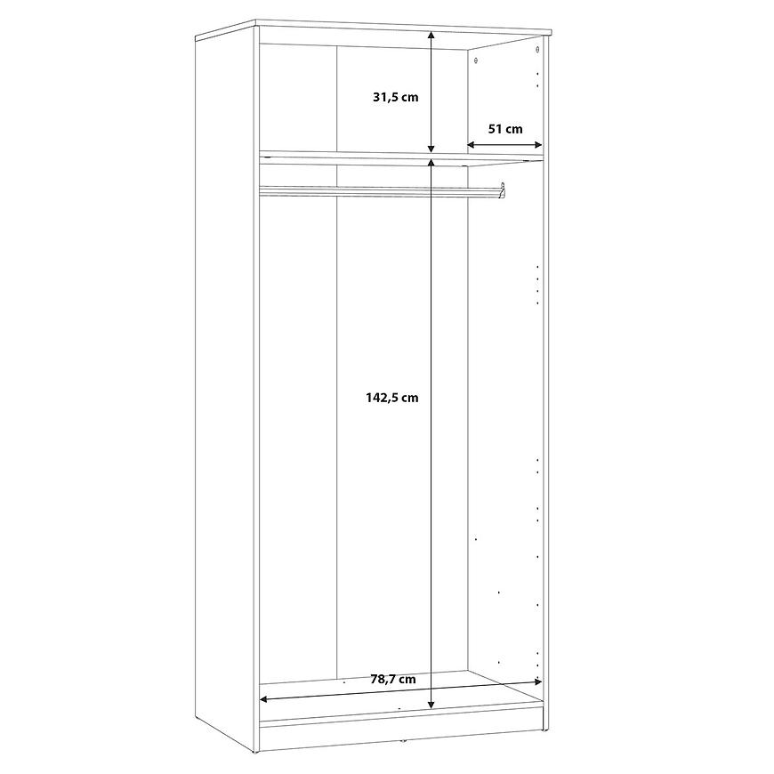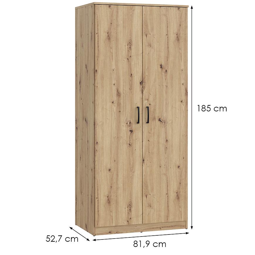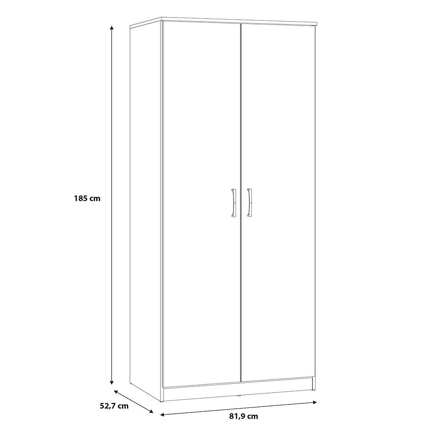 Niko to szafa o imponujących wymiarach - mierzy 185 cm wysokości, 81,9 cm szerokości i 52,7 cm głębokości. Ta dwudrzwiowa szafa z klasycznymi drzwiami oferuje mnóstwo miejsca do przechowywania, wystarczająco, aby pomieścić wszystkie Twoje ubrania, akcesoria i wiele innych rzeczy. Dodatkowo istnieje możliwość dokupienia nadstawek, zapewniając jeszcze więcej miejsca do przechowywania.