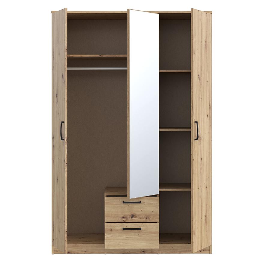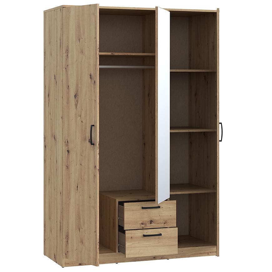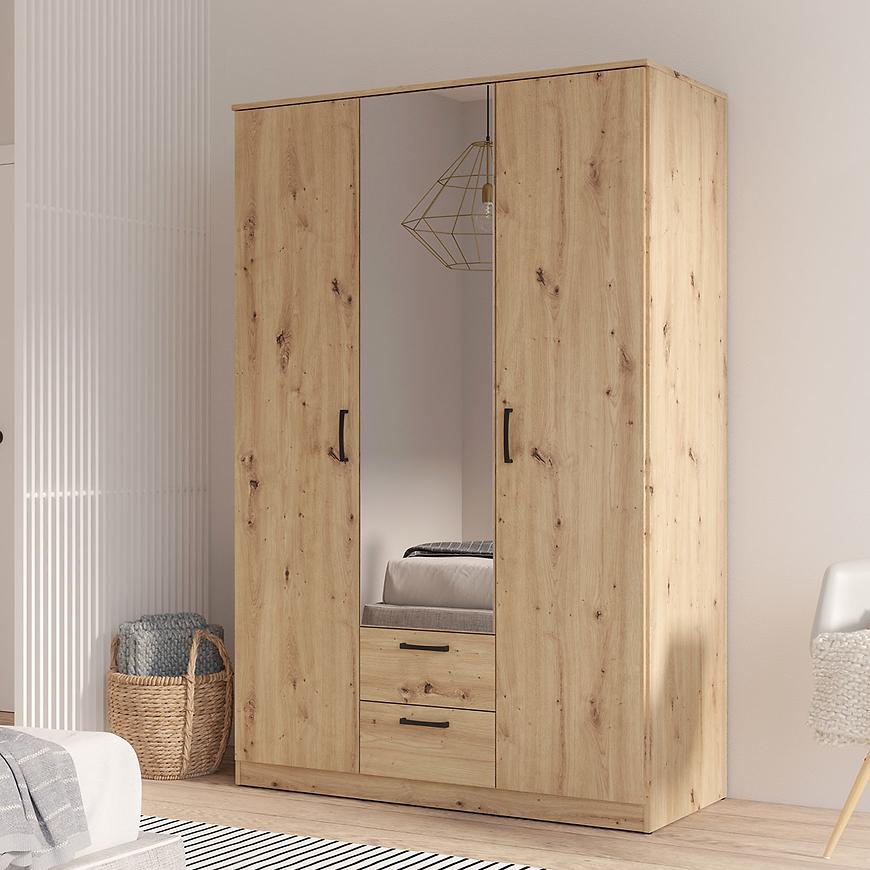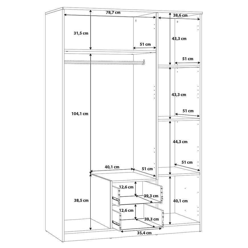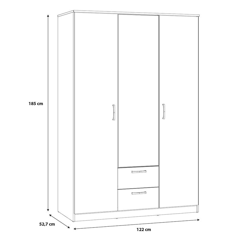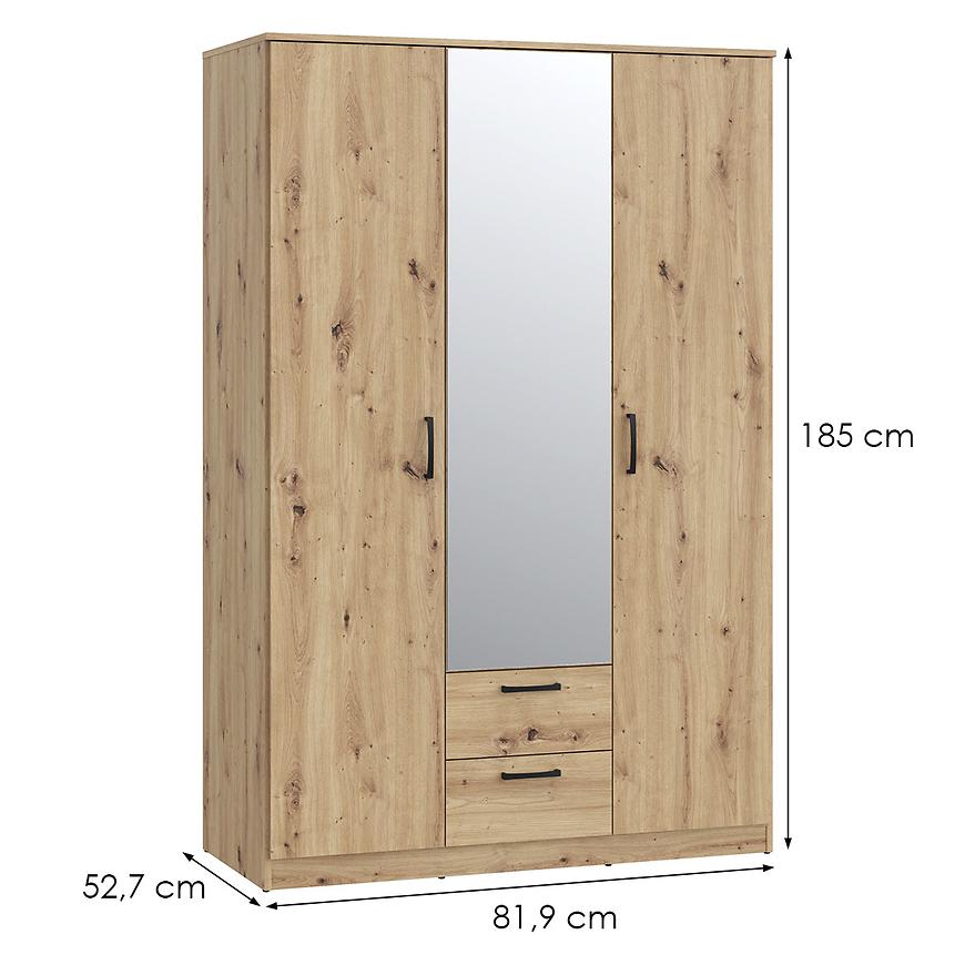 Szafa Niko to imponujący mebel o wymiarach 185 cm wysokości, 122 cm szerokości i 52,7 cm głębokości. Trzydrzwiowe segmentny z lustrzanym frontem wyposażone w półki i drążek na ubrania oraz dwie szuflady, zapewnią Ci mnóstwo przestrzeni do przechowywania. Bez względu na to, czy potrzebujesz miejsca na ubrania, akcesoria, czy inne przedmioty, ta szafa sprosta Twoim potrzebom. Dodatkowo, do szafy można dokupić nadstawkę, dzięki której zyskasz dodatkowe miejsce do przechowywania np. pościeli czy innych przedmiotów.