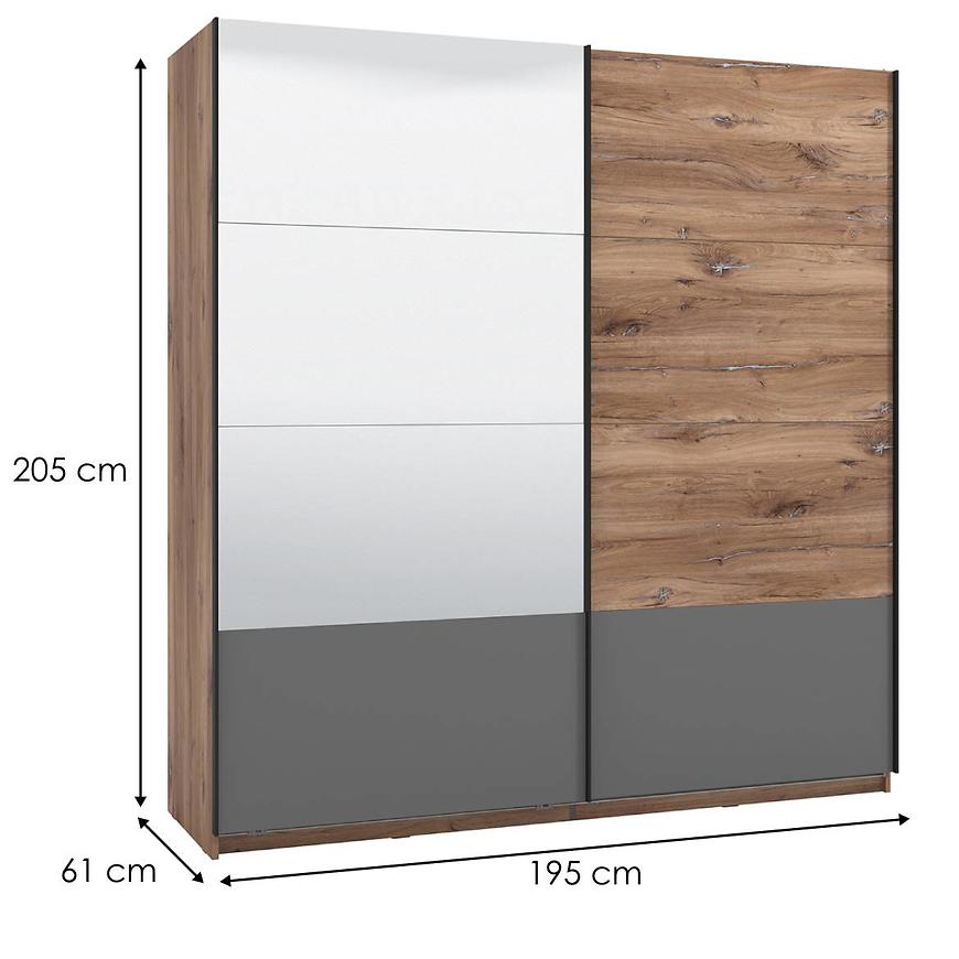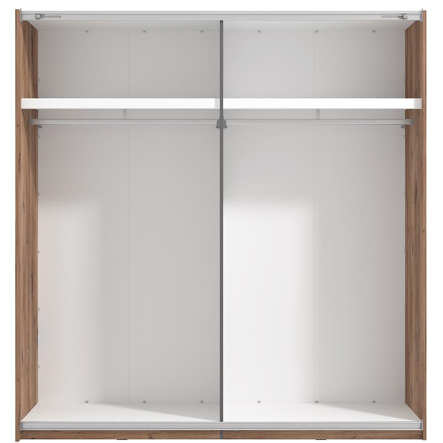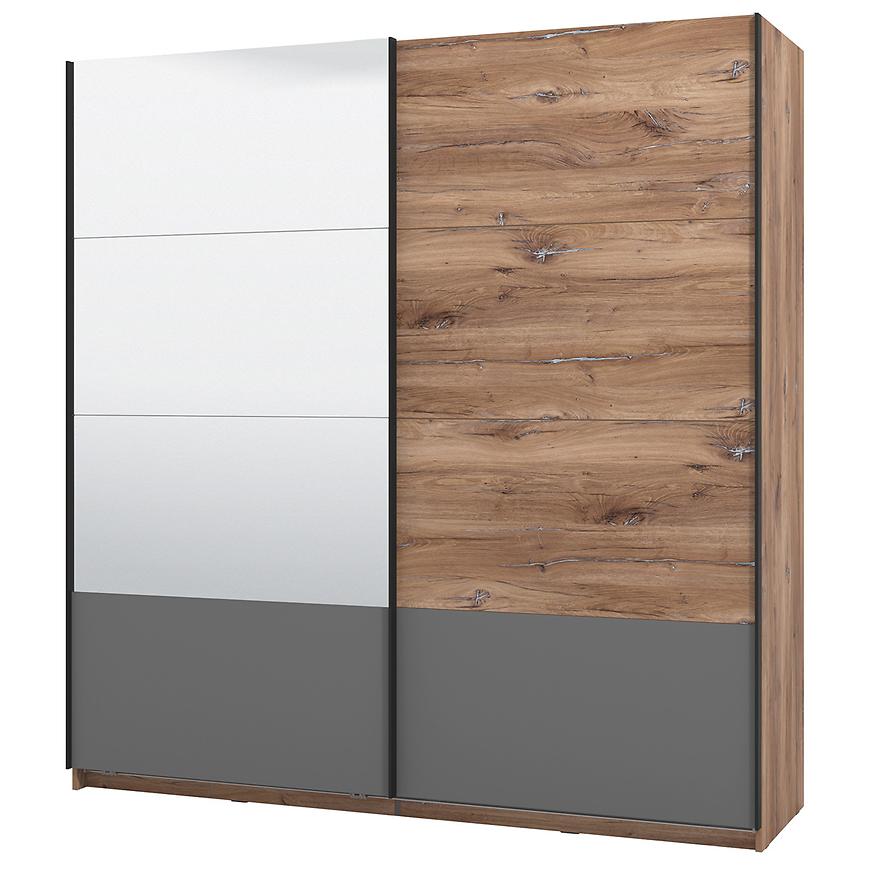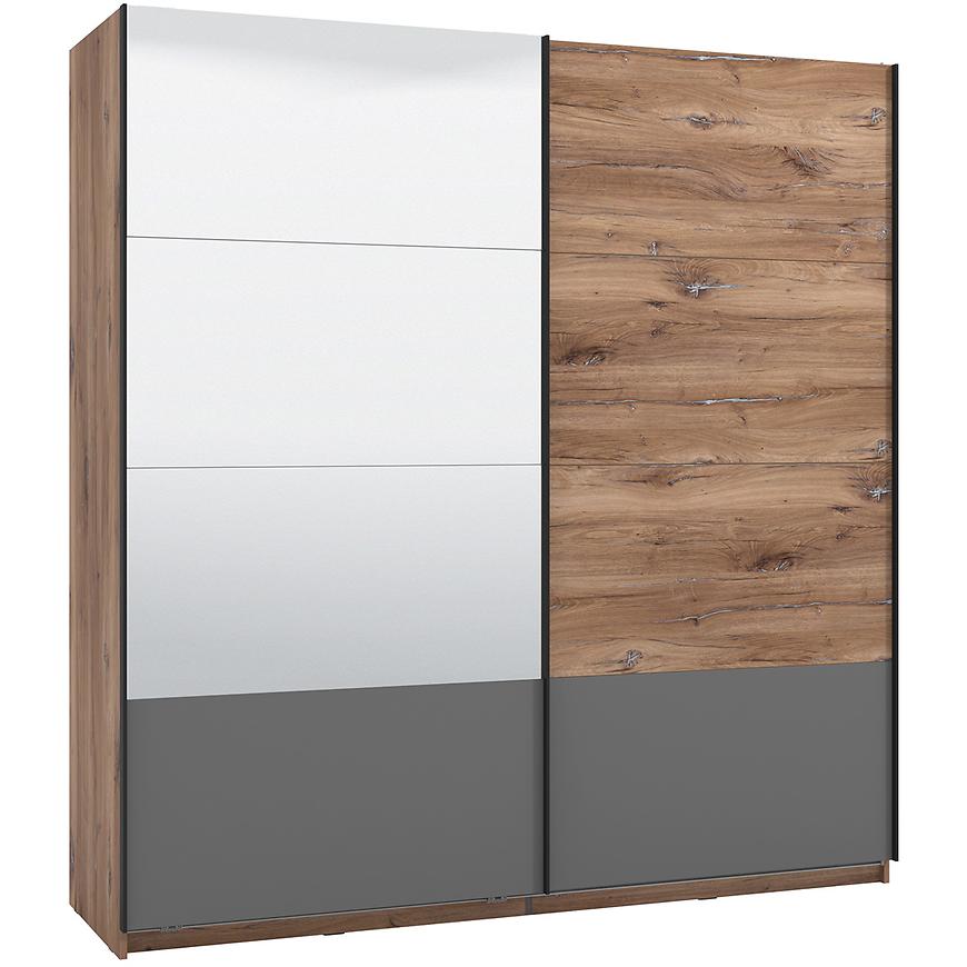 Prosty, nowoczesny kształt Szafy jest doskonałym uzupełnieniem różnych stylów aranżacji wnętrz. Drzwi przesuwne, które są charakterystyczną cechą tej szafy, pozwalają zaoszczędzić przestrzeń, ponieważ nie wymagają otwierania na zewnątrz. Dwudrzwiowy układ drzwi ułatwia dostęp do zawartości szafy, a lustro na jednym z drzwi dodaje praktyczności i ułatwia poranne przygotowania.