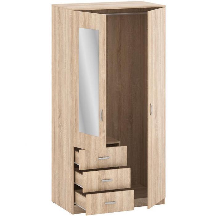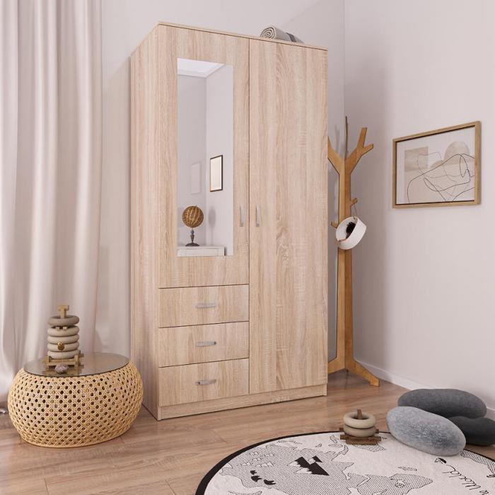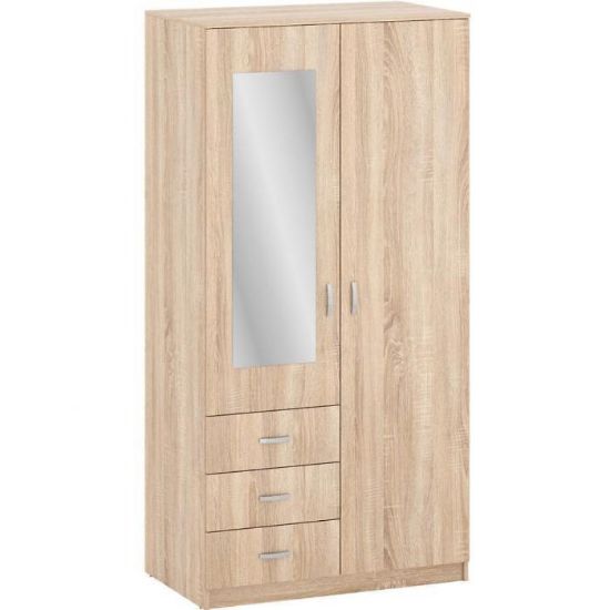 Szafa w kolorze dąb sonoma z kolekcji Olimpia to doskonała propozycja do pokoju dziennego, ale znajdzie swoje miejsce również w innym pomieszczeniu, jak na przykład - przedpokój czy garderobie, sypialni. Materiał wykonania to płyta laminowana. Szafa posiada półki, drążek na ubrania oraz szuflady. Duża szafa posiada również lustro, które sprawi, że pomieszczenie stanie się optycznie większe. Wygląd szafy sprawi, że wpasuje się w większość aranżacji. Szafa będzie świetnym miejscem do wieszania ubrań, na buty lub inne domowe tekstylia. Nowoczesny styl mebli wpadnie do gustu każdemu, kto poszukuje eleganckiego, klasycznego, a zarazem nowoczesnego umeblowania. Szafa przeznaczona do samodzielnego montażu.