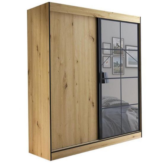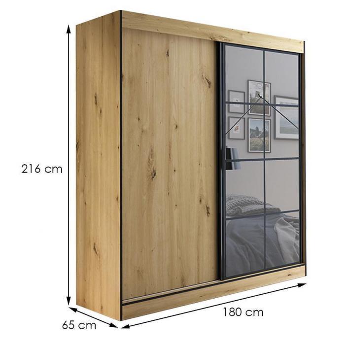 Szafa przesuwna w kolorze dąb artisan/czarny propozycja do pokoju dziennego, ale znajdzie swoje miejsce również w innym pomieszczeniu, jak na przykład - przedpokój czy garderobie. Materiał wykonania to płyta wiórowa laminowana. Szafa posiada lustro, które sprawi, że pomieszczenie stanie się optycznie większe. Nowoczesny styl mebli wpadnie do gustu każdemu, kto poszukuje eleganckiego, klasycznego, a zarazem nowoczesnego umeblowania. Idealnie wpasuje się w większość aranżacji. Przeznaczona do samodzielnego montażu.
