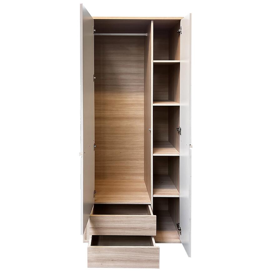 Szafa została wykonana z płyty wiórowej laminowanej, co gwarantuje wytrzymałość i stabilność mebla. Waga 86 kg świadczy o jej solidności, dzięki czemu szafa pewnie utrzymuje zawartość, zapewniając bezpieczeństwo i porządek w pomieszczeniu. Klasyczne dwudrzwiowe fronty ułatwiają dostęp do wnętrza, a przestronne półki i drążki pozwalają na wygodne uporządkowanie ubrań.