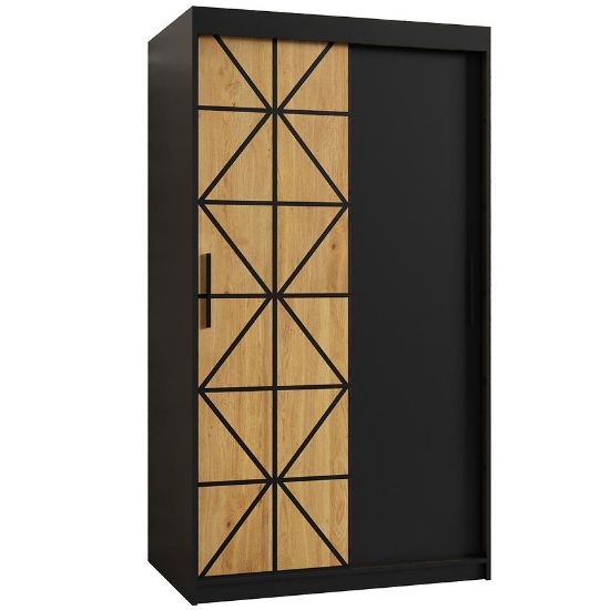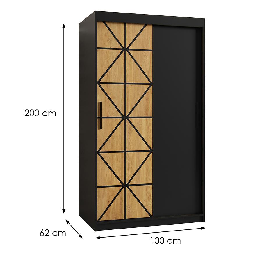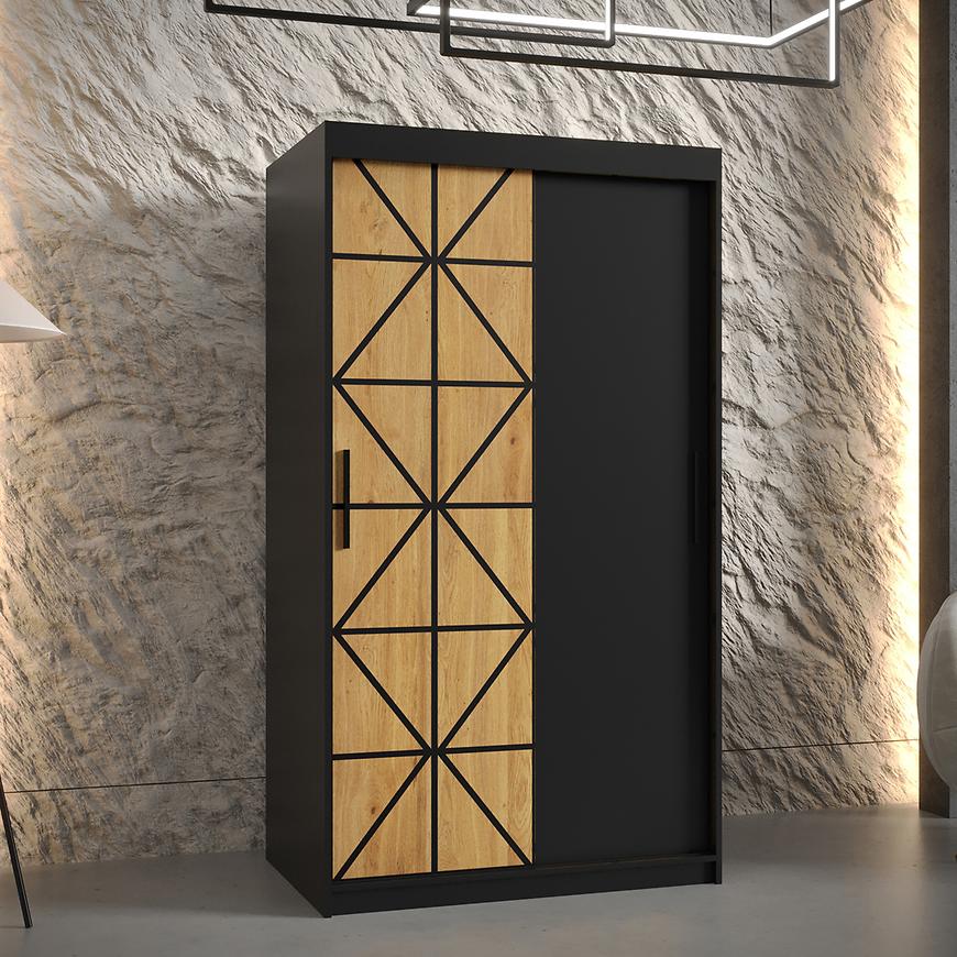 Estetyczne połączenie kolorystyczne czerni z jasnym, drewnopodobnym odcieniem nadaje szafie unikalny charakter. Charakterystyczny geometryczny dekor na froncie to wyrafinowany akcent, który nadaje meblowi indywidualny styl.