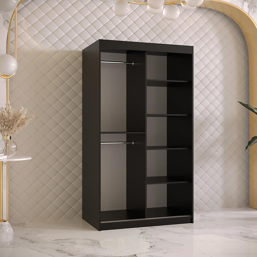 Dwudrzwiowy segment z drzwiami przesuwnymi to nie tylko oszczędność przestrzeni, ale także elegancja w codziennym użytkowaniu. Dwa drążki na ubrania i cztery półki umożliwiają uporządkowanie garderoby, zachowując jednocześnie estetykę wnętrza.