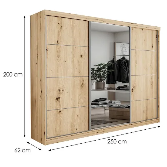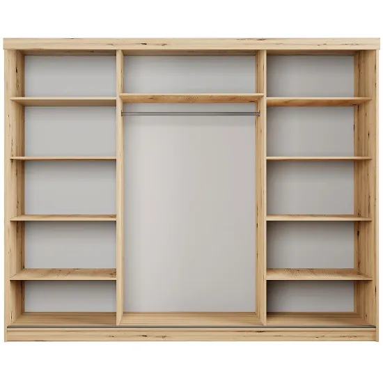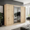 Wykonana z trwałej płyty wiórowej laminowanej o matowym, artisan wykończeniu, szafa Palermo prezentuje się elegancko i uniwersalnie. Duże lustro umieszczone na froncie nie tylko optycznie powiększa przestrzeń, ale również pełni praktyczną funkcję na co dzień. Wnętrze szafy wyposażono w półki i drążek na ubrania, co umożliwia wygodne i uporządkowane przechowywanie garderoby.