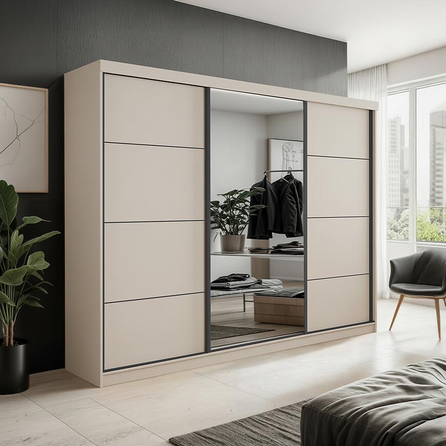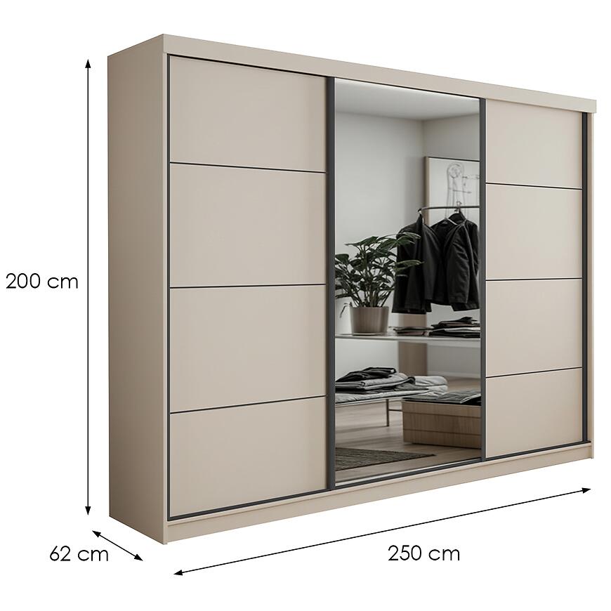 Szafa Palermo 250 kaszmir/lustro to mebel, który łączy nowoczesny styl z praktycznymi rozwiązaniami do przechowywania. Trzy przesuwne drzwi z lustrem, przestronne wnętrze i solidna konstrukcja sprawiają, że szafa jest nie tylko estetycznym elementem wyposażenia wnętrza, ale także funkcjonalnym i trwałym meblem, który sprosta wymaganiom codziennego użytkowania.