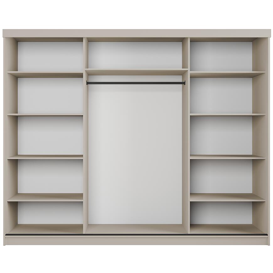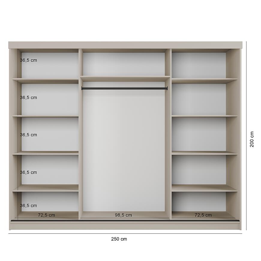 Szafa Palermo 250 została zaprojektowana z myślą o wygodnym przechowywaniu. Trzy przesuwne drzwi z lustrem zapewniają łatwy dostęp do wnętrza, a przestrzeń za nimi umożliwia swobodne rozmieszczenie ubrań, dodatków czy innych przedmiotów. Lustro wbudowane w fronty nie tylko powiększa optycznie przestrzeń, ale także ułatwia codzienne użytkowanie.
