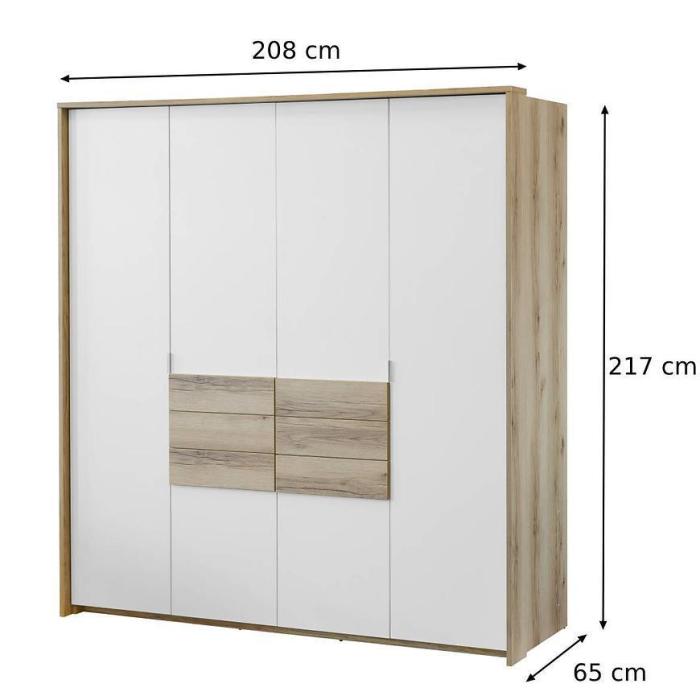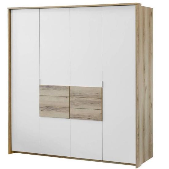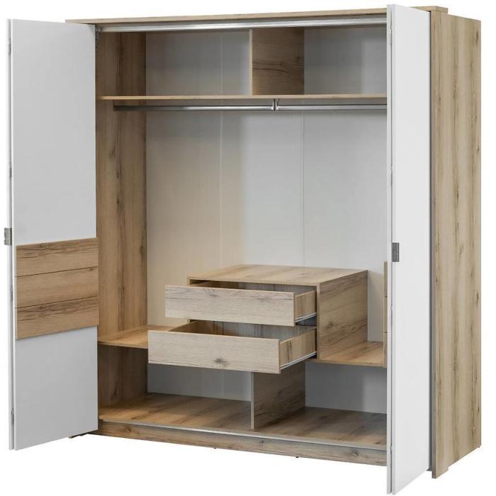 Szafa Panama to doskonała propozycja do sypialni i garderoby, ale znajdzie swoje miejsce też w innym pomieszczeniu jak np. przedpokój. Całość dostępna w kolorze białym, a korpus w kolorze dąb grand natural. Doskonale ocieli wnętrze. Korpus i fronty w matowym wykończeniu. Szafa posiada drzwi uchylne i przesuwne. Szafa posiada półki, szuflady oraz drążki na ubrania. Nowoczesny styl mebli wpadnie do gustu każdemu, kto poszukuje eleganckiego, klasycznego, a zarazem nowoczesnego umeblowania.