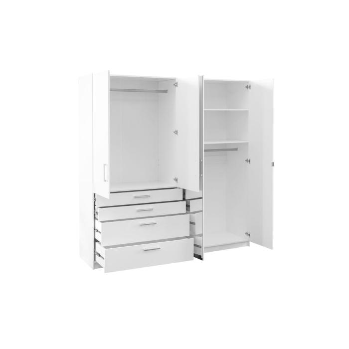 Szafa czterodrzwiowa z uchylnymi drzwiami. Wykonana w kolorze matowej bieli. Na froncie drzwi znajduje się lustro. Szafa Pekos Lux posiada aluminiowe prowadnice kulkowe. Szafa posiada dwa drążki na ubrania, cztery pojemne szuflady oraz dwie półki. Produkt do samodzielnego montażu.
