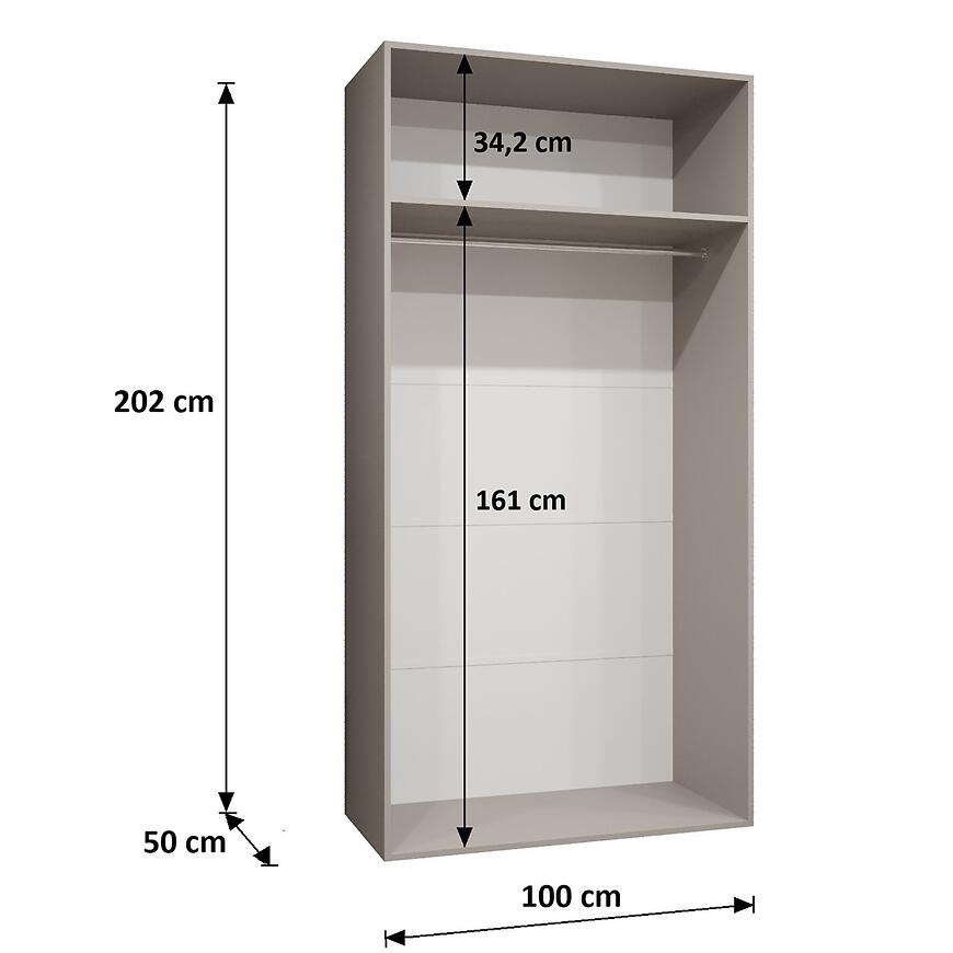 Wymiary szafy – szerokość 100 cm, wysokość 202 cm i głębokość 52 cm – zapewniają praktyczną przestrzeń do przechowywania odzieży, tekstyliów i innych akcesoriów. Model bez lustra, wyposażony w klasyczne drzwi uchylne, umożliwia łatwy dostęp do wnętrza i wygodne porządkowanie rzeczy.