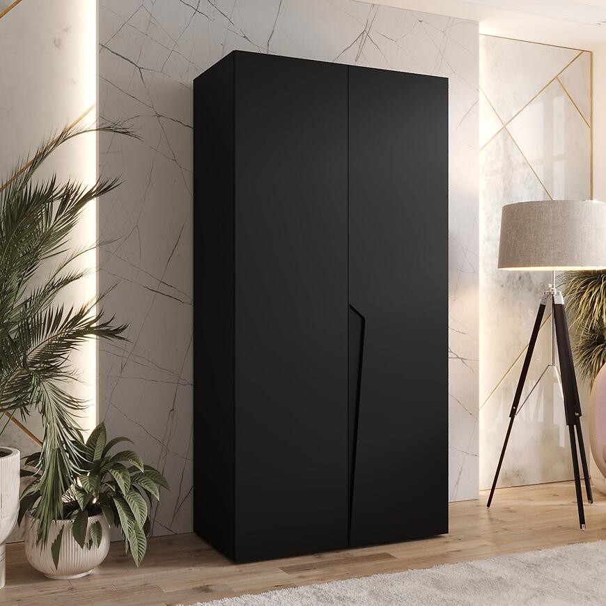 Szafa Piano 1-100 w wybarwieniu czarny/czarny to nowoczesna dwudrzwiowa szafa, która łączy minimalistyczny design z funkcjonalnością. Prosta bryła, matowe wykończenie frontów i korpusu oraz jednolita, głęboka czerń nadają meblowi elegancki i wyrazisty charakter.