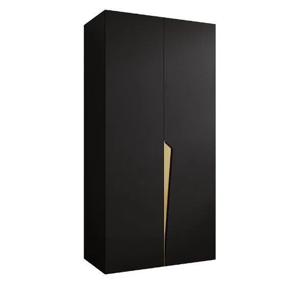 Szafa Piano 1-100 w wybarwieniu czarny/złoty to elegancka dwudrzwiowa szafa, która łączy minimalistyczny design z praktyczną funkcjonalnością. Prosta bryła, matowe wykończenie frontów i korpusu oraz subtelny złoty detal nadają meblowi luksusowy i nowoczesny charakter.