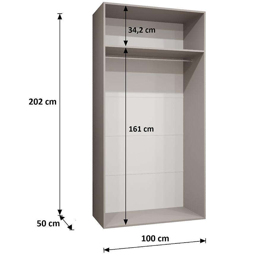 Wymiary – szerokość 100 cm, wysokość 202 cm i głębokość 52 cm – zapewniają wygodną przestrzeń do przechowywania odzieży, tekstyliów i innych przedmiotów. Model bez lustra, wyposażony w klasyczne drzwi uchylne, umożliwia łatwy dostęp do wnętrza i wygodne utrzymanie porządku.