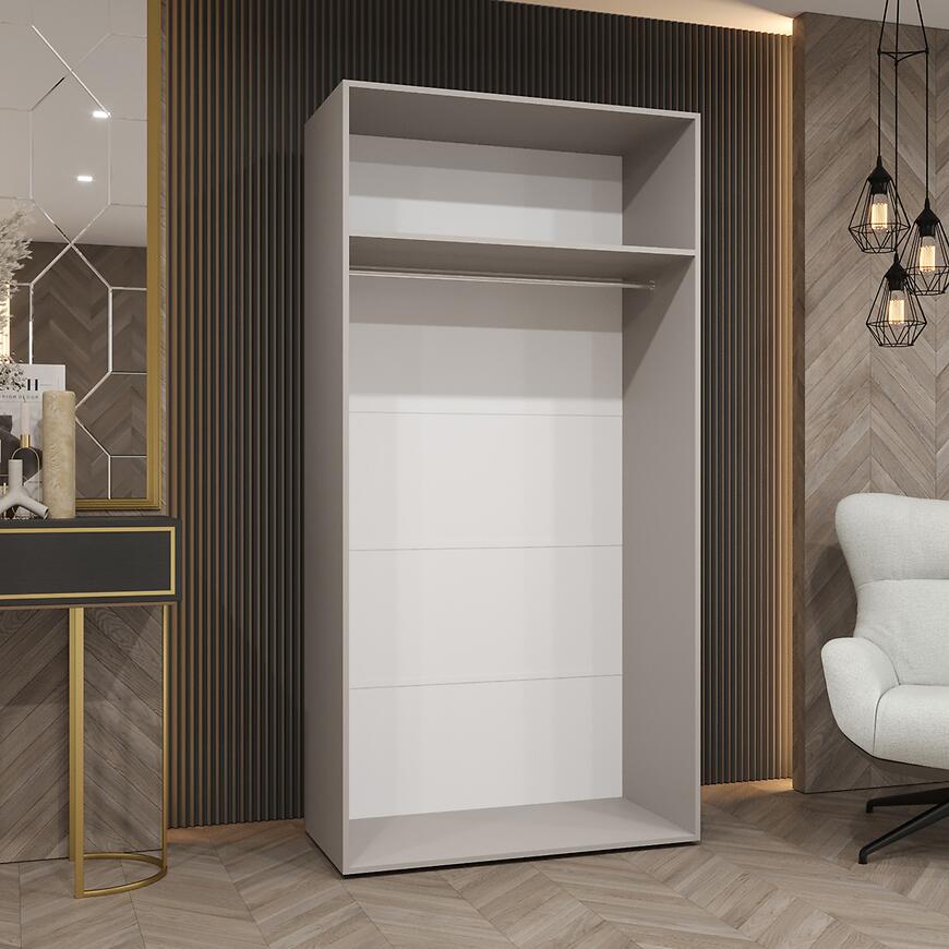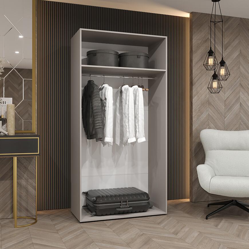 Model Piano 1-100 oferuje przemyślaną przestrzeń do przechowywania przy kompaktowych wymiarach. Dwudrzwiowa konstrukcja pozwala na wygodne organizowanie garderoby, a brak lustra i matowe fronty tworzą elegancką, spójną powierzchnię.