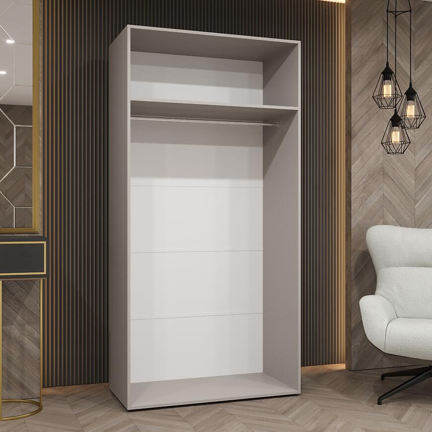 Model Piano 1-100 oferuje przemyślaną przestrzeń do przechowywania przy kompaktowych wymiarach. Dwudrzwiowa konstrukcja pozwala na wygodne organizowanie garderoby, a brak lustra i matowe fronty tworzą elegancką, spójną powierzchnię.