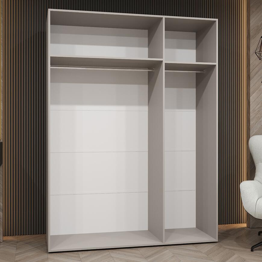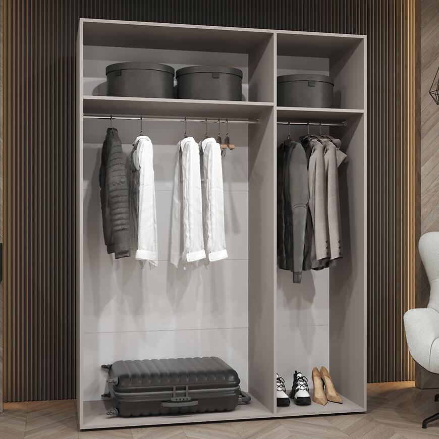 Model Piano 1-150 oferuje przemyślaną przestrzeń do przechowywania przy szerokości 150 cm. Trzydrzwiowa konstrukcja pozwala na wygodne porządkowanie garderoby, a brak lustra i matowe fronty tworzą elegancką, spójną powierzchnię.