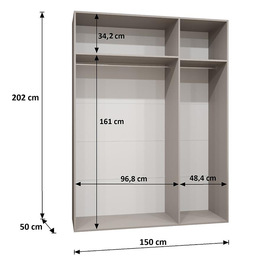 Wymiary – szerokość 150 cm, wysokość 202 cm i głębokość 52 cm – zapewniają pojemną przestrzeń do przechowywania odzieży, tekstyliów i innych przedmiotów. Model bez lustra, z klasycznymi drzwiami uchylnymi, umożliwia wygodny dostęp do wnętrza i praktyczne utrzymanie porządku.