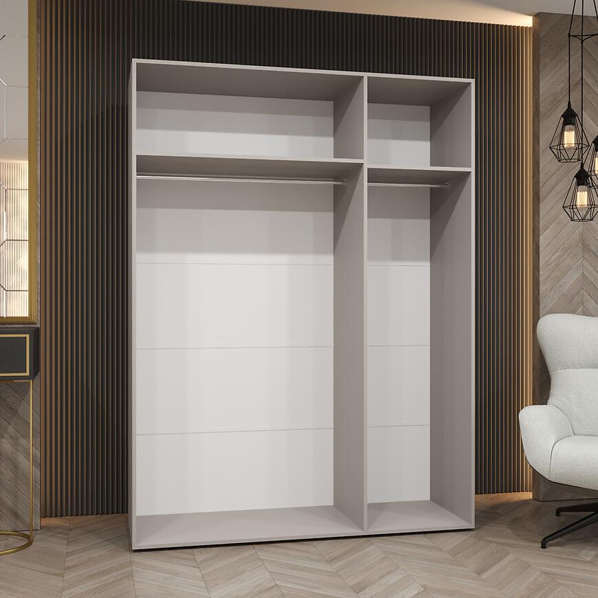 Model Piano 1-150 oferuje dużą przestrzeń do przechowywania przy szerokości 150 cm. Trzydrzwiowa konstrukcja pozwala na wygodne organizowanie garderoby, a brak lustra i matowe fronty tworzą elegancką, spójną powierzchnię.