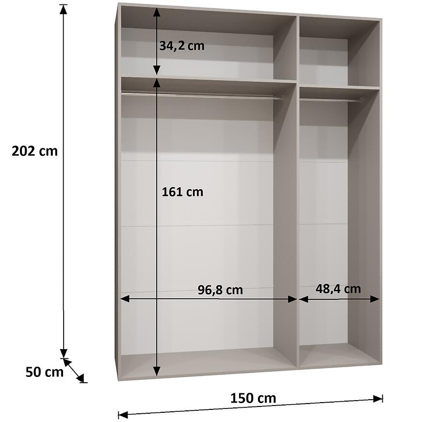 Wymiary – szerokość 150 cm, wysokość 202 cm i głębokość 52 cm – zapewniają pojemną przestrzeń do przechowywania odzieży, tekstyliów i innych przedmiotów. Model bez lustra, z klasycznymi drzwiami uchylnymi, umożliwia wygodny dostęp do wnętrza i komfortowe uporządkowanie rzeczy.