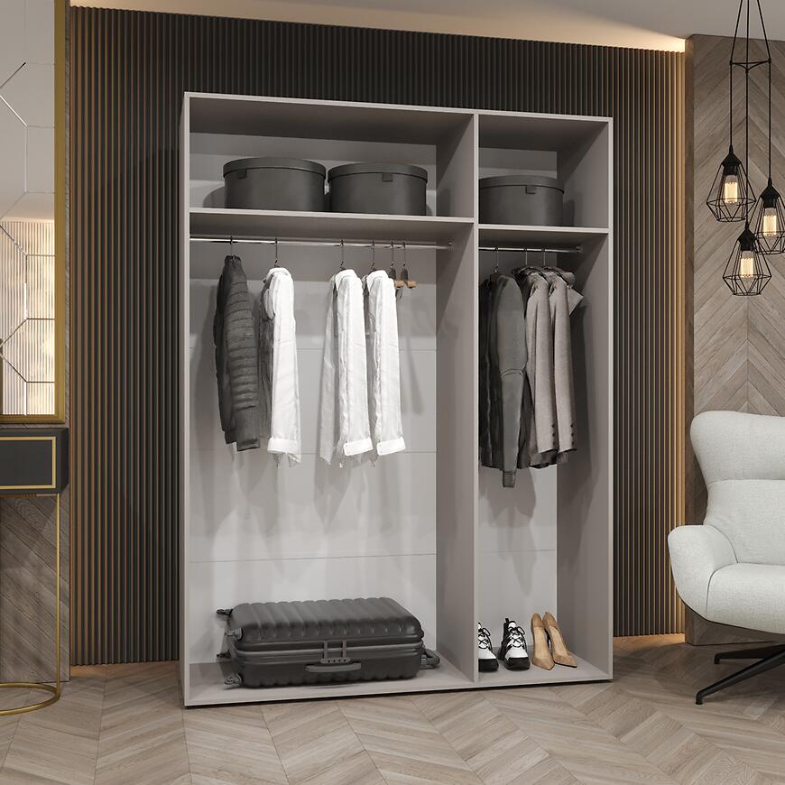 Model Piano 1-150 oferuje przemyślaną przestrzeń do przechowywania przy szerokości 150 cm. Trzydrzwiowa konstrukcja pozwala na wygodne organizowanie garderoby, a brak lustra i matowe fronty tworzą elegancką, spójną powierzchnię.