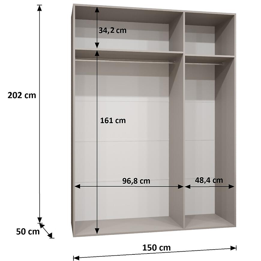 Wymiary – szerokość 150 cm, wysokość 202 cm i głębokość 52 cm – zapewniają przestronną powierzchnię do przechowywania odzieży, tekstyliów i innych przedmiotów. Model bez lustra, z klasycznymi drzwiami uchylnymi, umożliwia wygodny dostęp do wnętrza i komfortowe utrzymanie porządku.