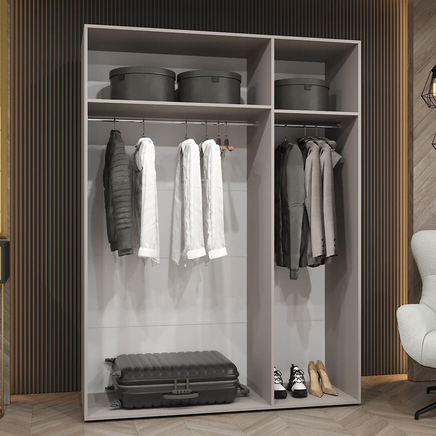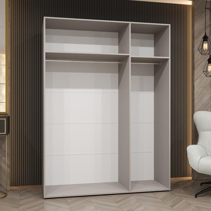 Model Piano 1-150 oferuje dużą przestrzeń do przechowywania przy szerokości 150 cm. Trzydrzwiowa konstrukcja pozwala na wygodne organizowanie garderoby, a brak lustra i matowe fronty tworzą elegancką, spójną powierzchnię.