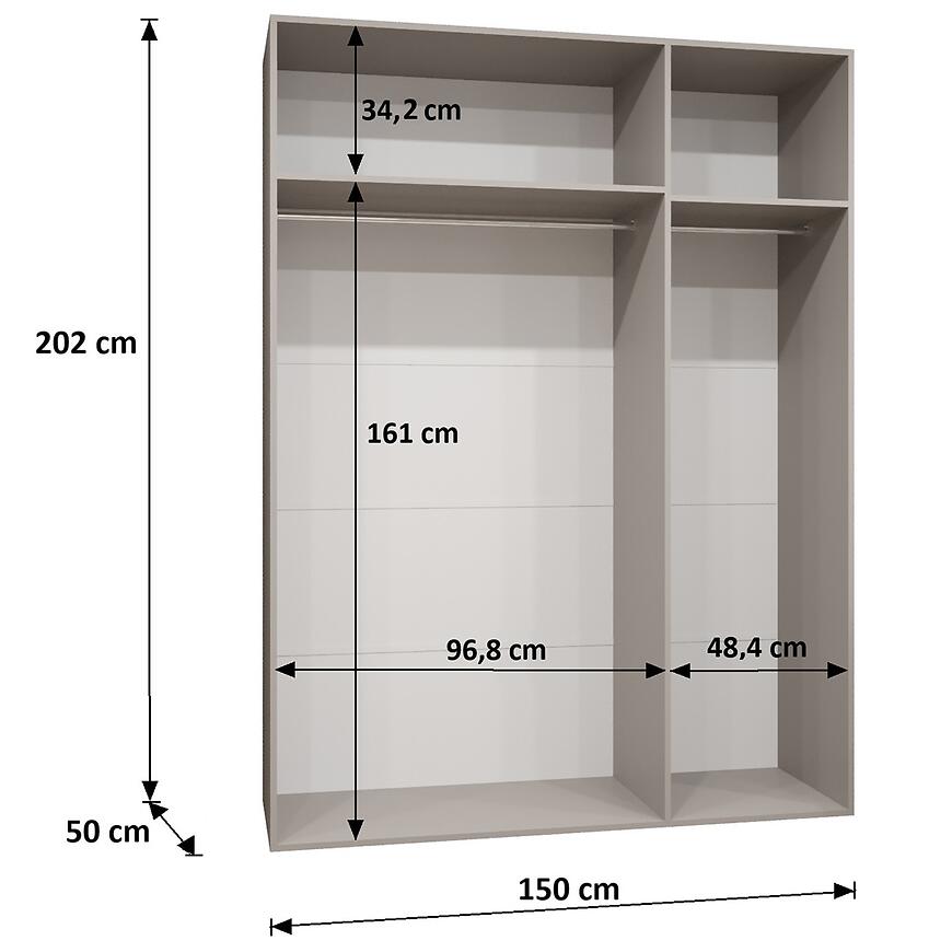 Dzięki wymiarom – szerokość 150 cm, wysokość 202 cm i głębokość 52 cm – szafa oferuje przestronną powierzchnię do przechowywania odzieży, tekstyliów i innych elementów wyposażenia. Model bez lustra, z klasycznymi drzwiami uchylnymi, umożliwia wygodny dostęp do wnętrza i komfortowe uporządkowanie rzeczy.