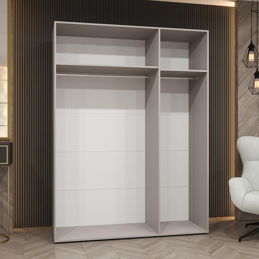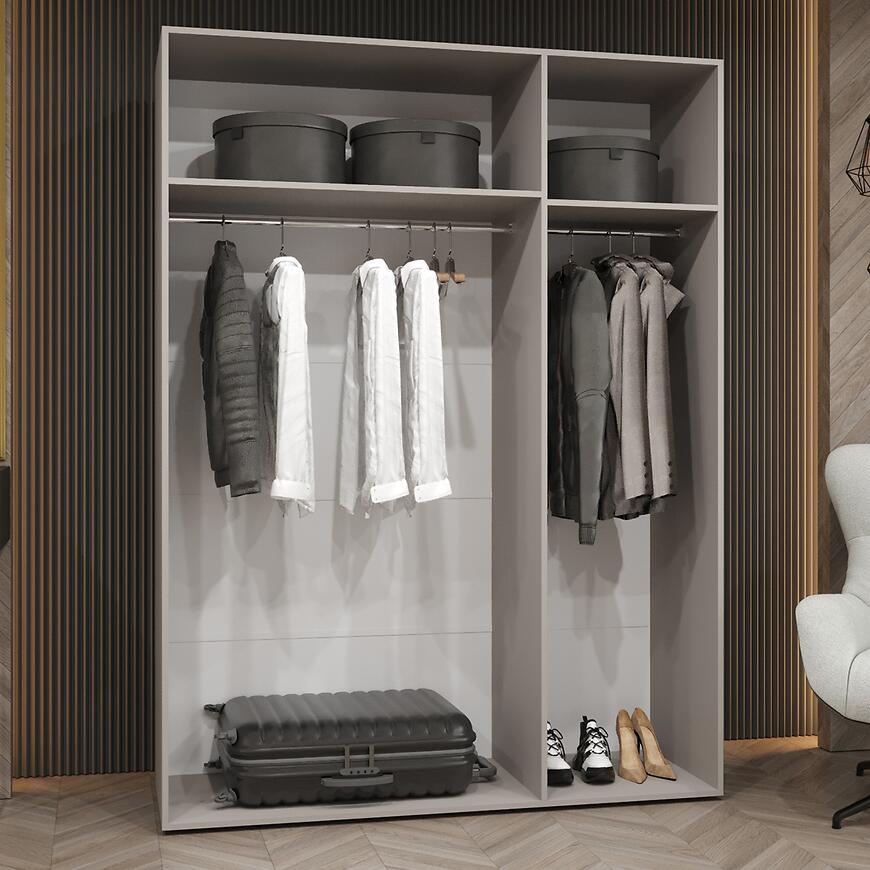Model Piano 1-150 oferuje przemyślaną przestrzeń do przechowywania przy szerokości 150 cm. Trzydrzwiowa konstrukcja pozwala na wygodne organizowanie garderoby, a brak lustra i matowe fronty tworzą elegancką, spójną powierzchnię.