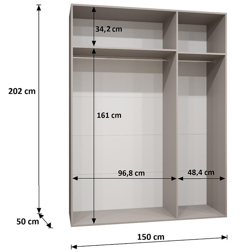 Wymiary – szerokość 150 cm, wysokość 202 cm i głębokość 52 cm – zapewniają przestronną powierzchnię do przechowywania odzieży, tekstyliów i innych przedmiotów. Model bez lustra, z klasycznymi drzwiami uchylnymi, umożliwia wygodny dostęp do wnętrza i komfortowe utrzymanie porządku.