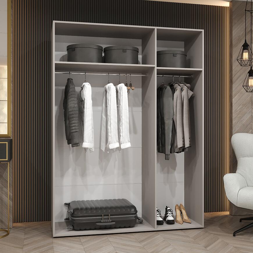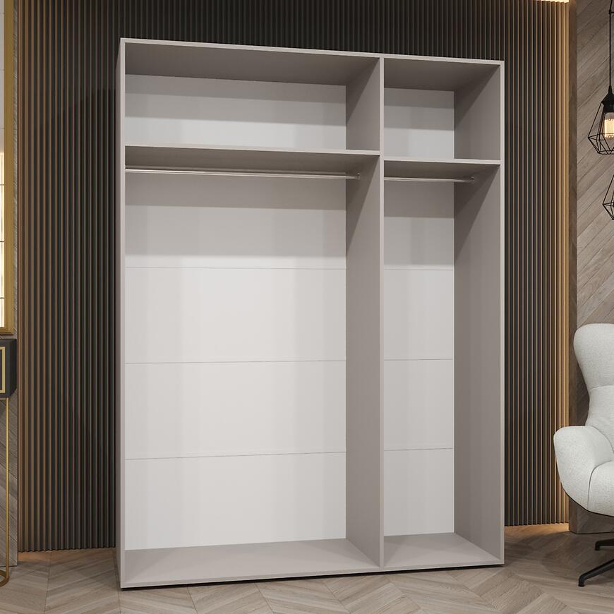 Model Piano 1-150 oferuje przemyślaną przestrzeń do przechowywania przy szerokości 150 cm. Trzydrzwiowa konstrukcja pozwala na wygodne porządkowanie garderoby, a brak lustra i matowe fronty tworzą elegancką, spójną powierzchnię.