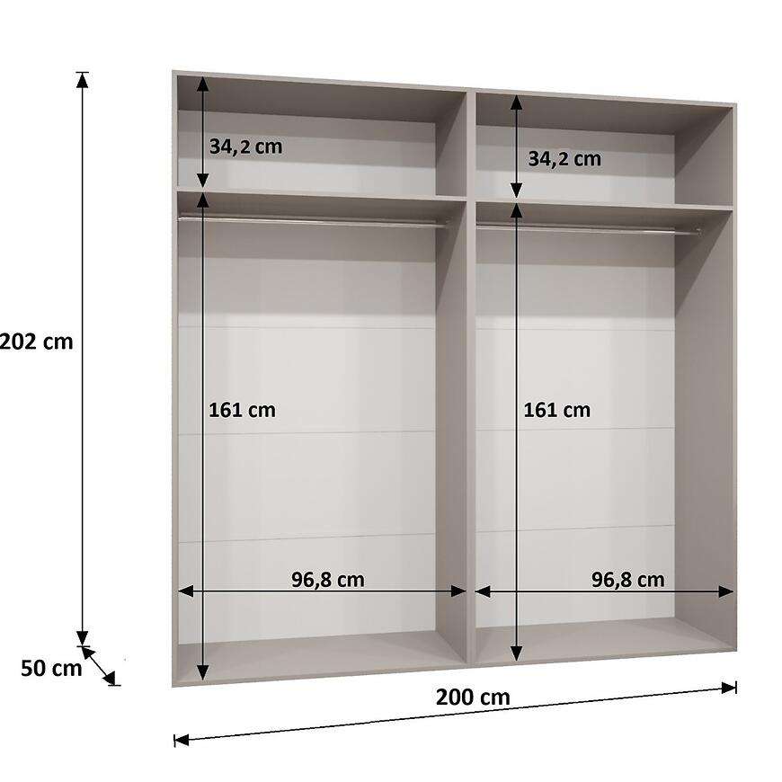 Wymiary – szerokość 200 cm, wysokość 202 cm i głębokość 52 cm – oferują dużą przestrzeń do przechowywania odzieży, tekstyliów i innych elementów wyposażenia. Model bez lustra, z klasycznymi drzwiami uchylnymi, zapewnia wygodny dostęp do wnętrza i komfortowe uporządkowanie rzeczy.