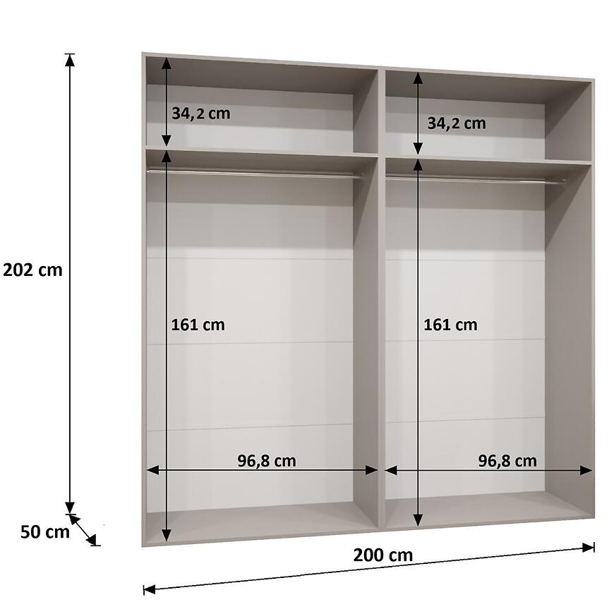 Wymiary szafy – szerokość 200 cm, wysokość 202 cm i głębokość 52 cm – zapewniają bardzo przestronną powierzchnię do przechowywania odzieży, tekstyliów i innych przedmiotów, co czyni szafę niezwykle funkcjonalnym elementem wyposażenia. Model bez lustra, z klasycznymi drzwiami uchylnymi, umożliwia wygodny dostęp do wnętrza i komfortowe utrzymanie porządku w codziennym użytkowaniu.