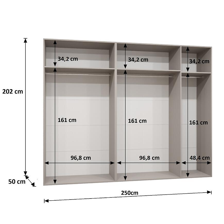 Dzięki wymiarom – szerokość 250 cm, wysokość 202 cm i głębokość 52 cm – szafa zapewnia dużą powierzchnię do przechowywania odzieży, tekstyliów i innych przedmiotów, umożliwiając wygodne porządkowanie wnętrza. Model bez lustra, z klasycznymi drzwiami uchylnymi, pozwala na łatwy dostęp do zawartości i komfortowe użytkowanie na co dzień.