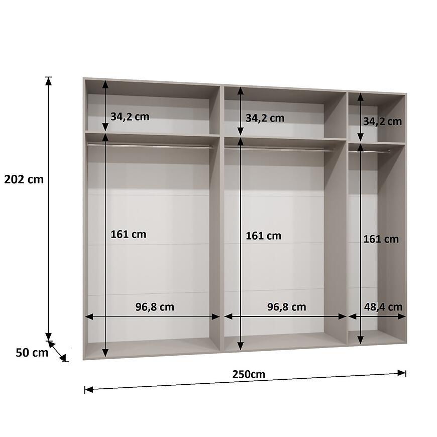 Wymiary – szerokość 250 cm, wysokość 202 cm i głębokość 52 cm – zapewniają obszerną powierzchnię do przechowywania odzieży, tekstyliów i innych przedmiotów, co ułatwia utrzymanie porządku. Model bez lustra, z klasycznymi drzwiami uchylnymi, gwarantuje wygodny dostęp do wnętrza i komfort codziennego użytkowania.