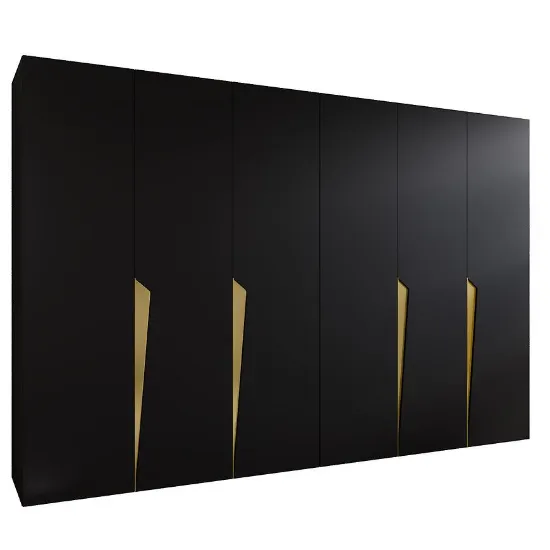 Szafa Piano 1-300 (2x150) czarny/złoty to przestronna kilkudrzwiowa szafa o eleganckim, matowym wykończeniu z subtelnym złotym akcentem. Prosta forma i wyrazista kolorystyka nadają wnętrzu nowoczesny charakter i wprowadzają stylową harmonię do każdej sypialni lub garderoby.