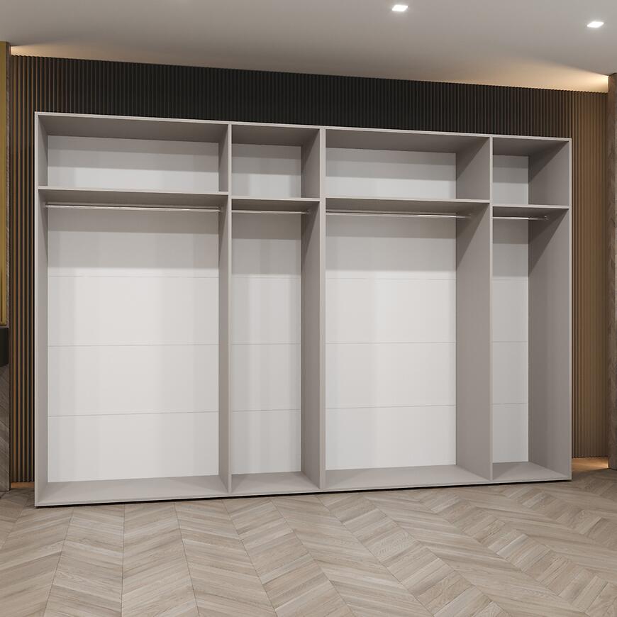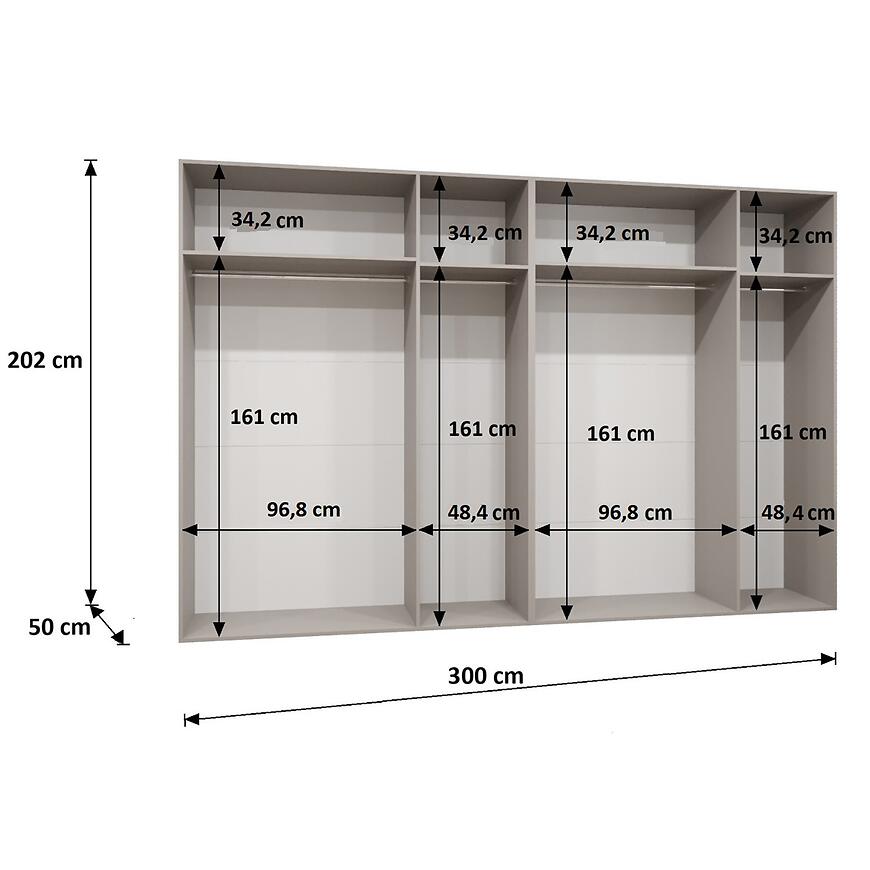 Dzięki szerokości 300 cm, wysokości 202 cm i głębokości 52 cm szafa oferuje komfortową przestrzeń do przechowywania ubrań, pościeli i dodatków. Konstrukcja 2x150 pozwala na podział wnętrza na dwa szerokie segmenty, co ułatwia organizację. Klasyczne drzwi uchylne zapewniają wygodny dostęp do całej zawartości.