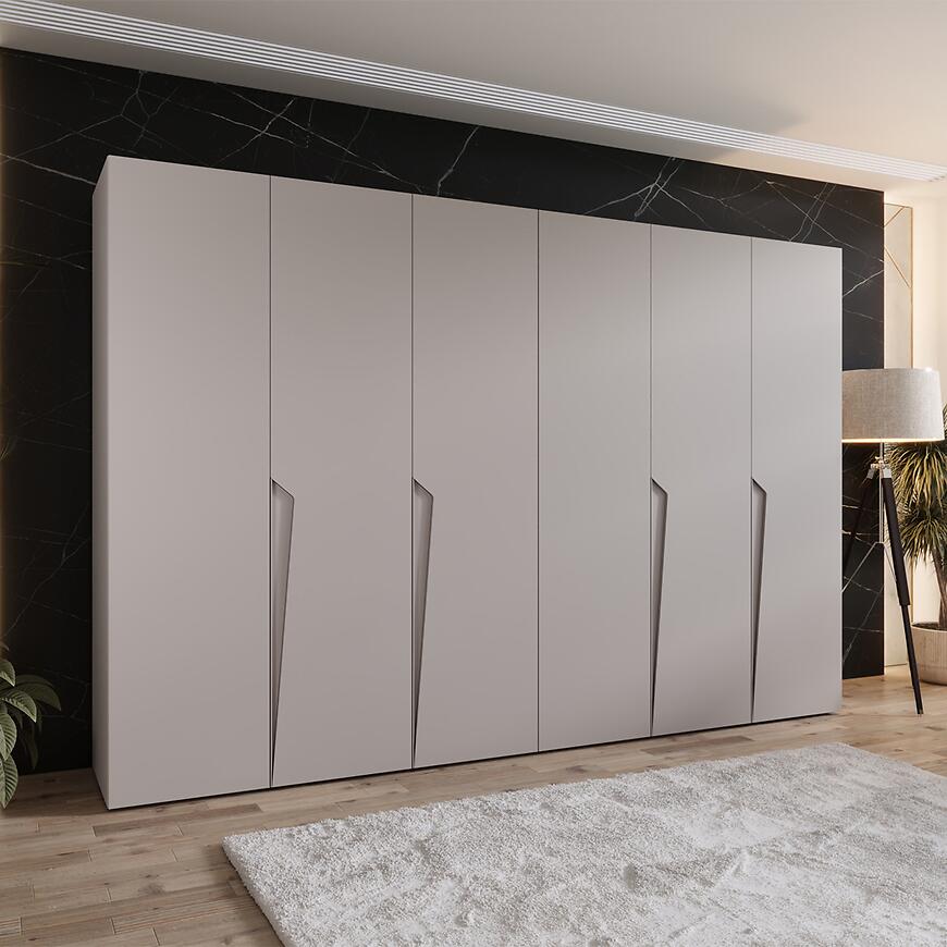 Szafa Piano 1-300 (2x150) kaszmir/kaszmir świetnie sprawdzi się w sypialni, garderobie, pokoju młodzieżowym czy przestronnych korytarzach, gdzie liczy się zarówno estetyka, jak i pojemność. Jej neutralny beżowy kolor kaszmir umożliwia łatwe dopasowanie do różnorodnych mebli i dodatków, a matowe wykończenie frontów i korpusu ogranicza widoczność odcisków palców i zarysowań, co zwiększa wygodę codziennego użytkowania.
