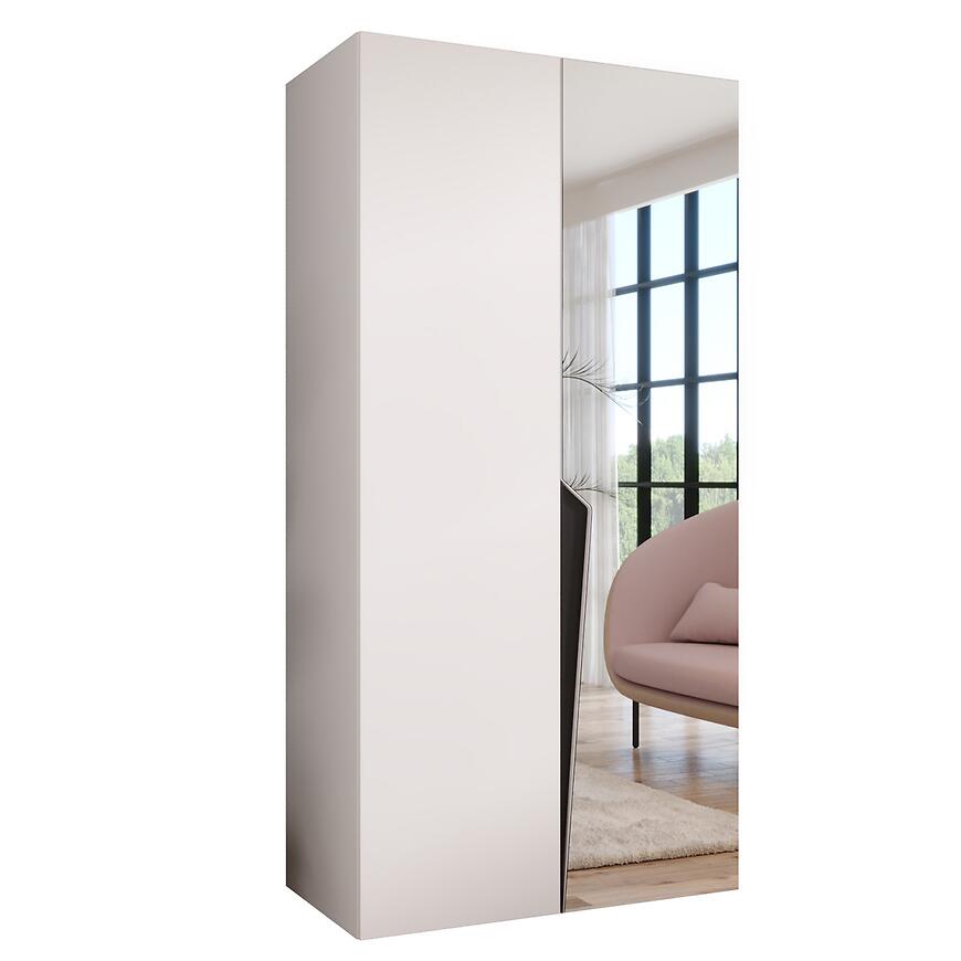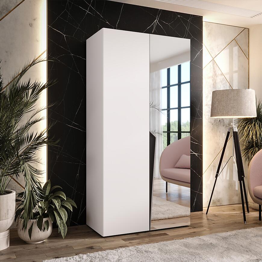 Szafa Piano 2-100 biały/czarny – nowoczesna dwudrzwiowa szafa z lustrem, 100 cm szerokości. Połyskujące białe fronty, matowy korpus, elegancka i funkcjonalna do sypialni lub przedpokoju.
