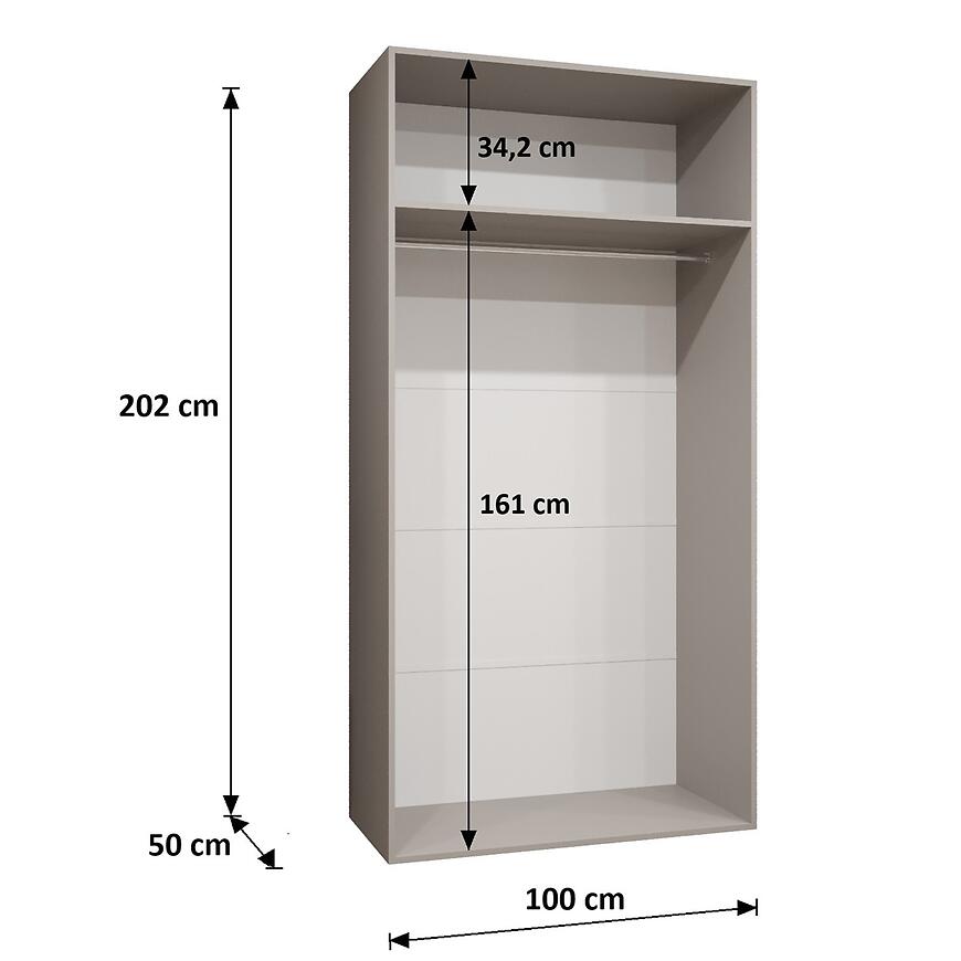 Szerokość 100 cm, wysokość 202 cm i głębokość 52 cm zapewniają wygodne miejsce do przechowywania odzieży i dodatków. Dwudrzwiowy system otwierania umożliwia komfortowy dostęp do całej zawartości.