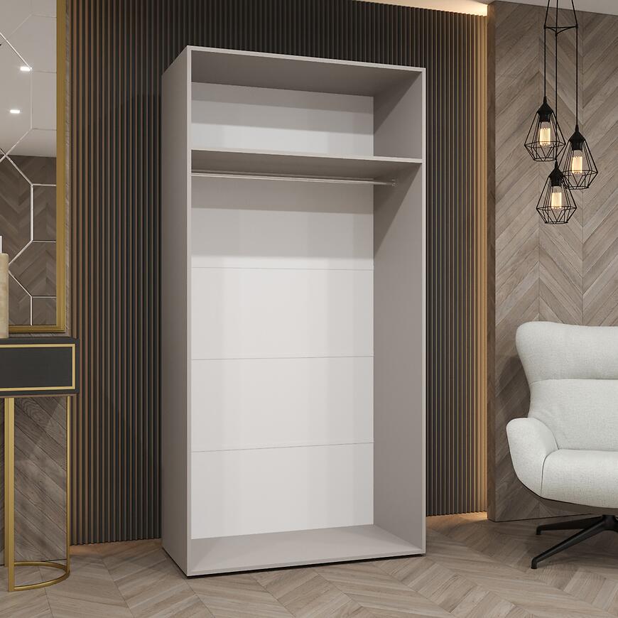 Szafa Piano 2-100 biały/złoty – nowoczesna szafa dwudrzwiowa z lustrem, 100 cm szerokości. Białe fronty w połysku, złote akcenty i pojemne wnętrze idealne do sypialni lub przedpokoju.