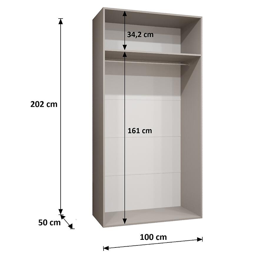 Szerokość 100 cm sprawia, że model idealnie sprawdzi się w mniejszych pomieszczeniach – sypialni, przedpokoju czy pokoju młodzieżowym. Wysokość 202 cm oraz głębokość 52 cm zapewniają wygodne miejsce do przechowywania odzieży i dodatków. Dwudrzwiowa konstrukcja z klasycznymi drzwiami umożliwia łatwy dostęp do całej zawartości.