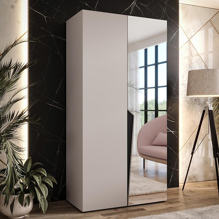 Szafa Piano 2-100 kaszmir/czarny to stylowe połączenie delikatnego odcienia kaszmiru z wyrazistą czernią. Jasne fronty w połysku nadają wnętrzu lekkości i nowoczesnego blasku, a kontrastowy akcent podkreśla elegancki charakter mebla. Lustro umieszczone na froncie dodatkowo optycznie powiększa przestrzeń i zwiększa funkcjonalność szafy.