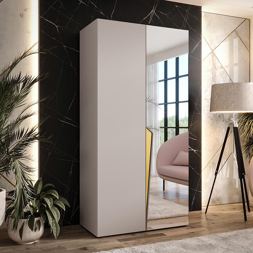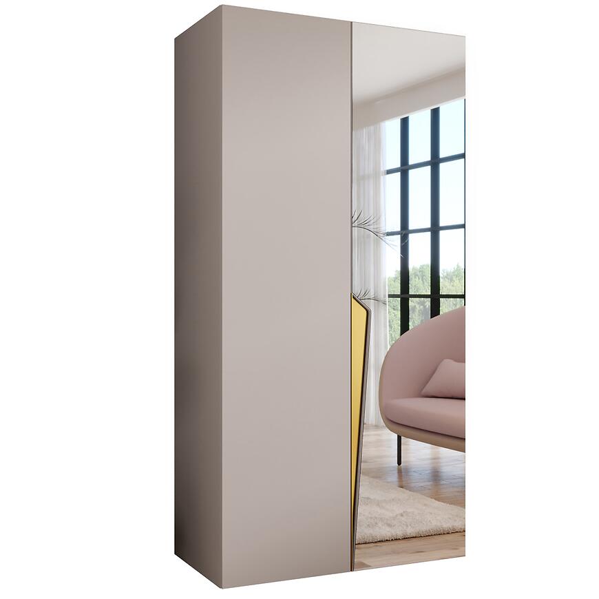 Szafa Piano 2-100 kaszmir/złoty – nowoczesna szafa dwudrzwiowa z lustrem, 100 cm szerokości. Fronty w połysku w kolorze kaszmir z eleganckim złotym akcentem, praktyczna i stylowa do sypialni lub przedpokoju.