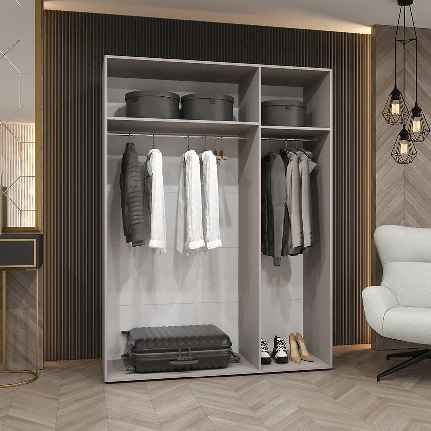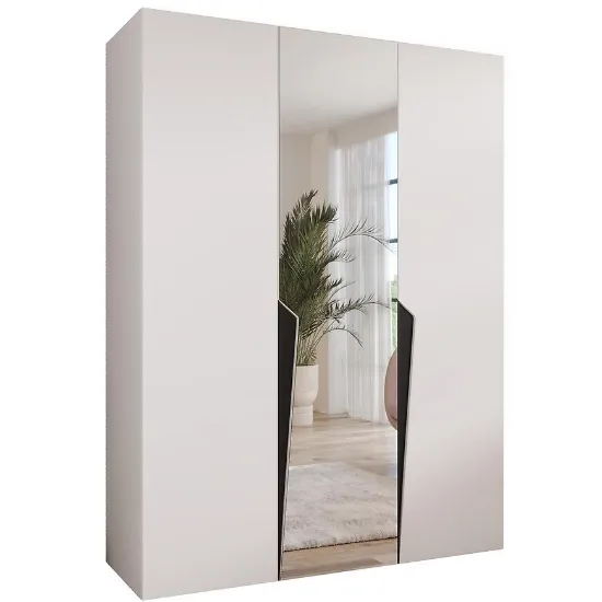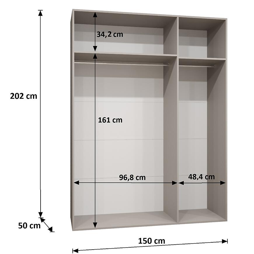 Szerokość 150 cm, wysokość 202 cm i głębokość 52 cm zapewniają komfortową przestrzeń do przechowywania ubrań i dodatków. Trzydrzwiowa konstrukcja umożliwia logiczny podział wnętrza i wygodny dostęp do wszystkich segmentów.